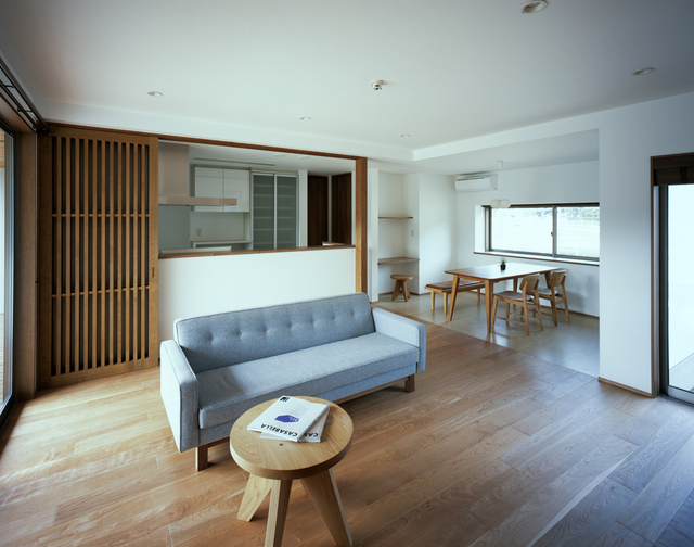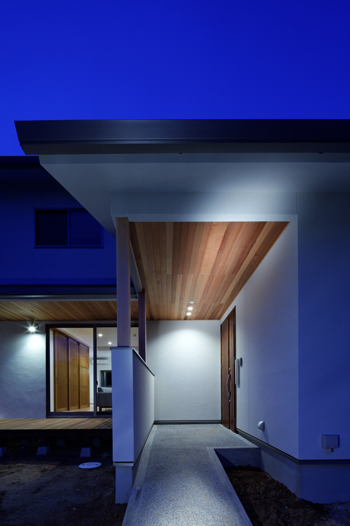 のどかな田園と、豊かな自然、静かな環境がこの土地の最大の魅力であり、その魅力ある環境を最大限生かせるプランが求められた。平面計画では、周囲に広がる緑の取り込みと、川から吹きそそぐ気持ちの良い風を通す事を目的に、計画的に開口部を配置した。家族の中心の場を、センターリビングとして定着させ、それを囲む様に各部屋は配置されている。南側のデッキに設けられた深い軒下は、降水量の少ない岡山特有の強い日差しをやわらげ、リビングに届けている。外観も特別な意匠やフィルムをほどこさず、オーソドックな切妻屋根とした。周囲に建つ日本家屋との調和を目的とし、時代の変化の中でも褪せる事なく、この風景の中で末長く佇み続けていく住宅である。