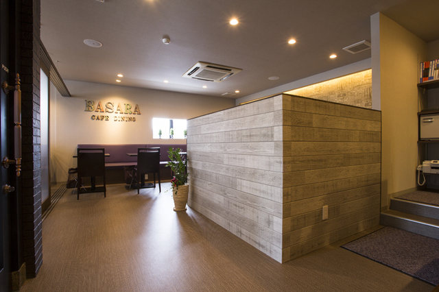 飲食業界に30年以上たずさわるオーナーと、奥さまが二人で立ちあげる、初めてのお店である。おいしい食事をゆっくり楽しめる事を前提に、店内は奥行きのあるカウンター、広々とした通路やホール席など、ゆとりのある平面レイアウトである。ヨーロピアンアンティーク調の店内には、編込パターンやヘンリーボンの床材、輸入クロスなどでその雰囲気をかもしだしている。また、ダークパープルの椅子には、男性(青)と女性(赤)が、交じり合い、どちらにも気軽に利用して頂きたい、という想いも込められている。夜の営業では、間接照明が店内をお昼とまた違う顔で演出し、お酒をたしなむ大人の空間へと変化していく。バサラは、子連れで、友人とのおしゃべりで、デートなどのさまざまなシーンで、食事を楽しみながら、気軽に利用していただけるカフェダイニングである。